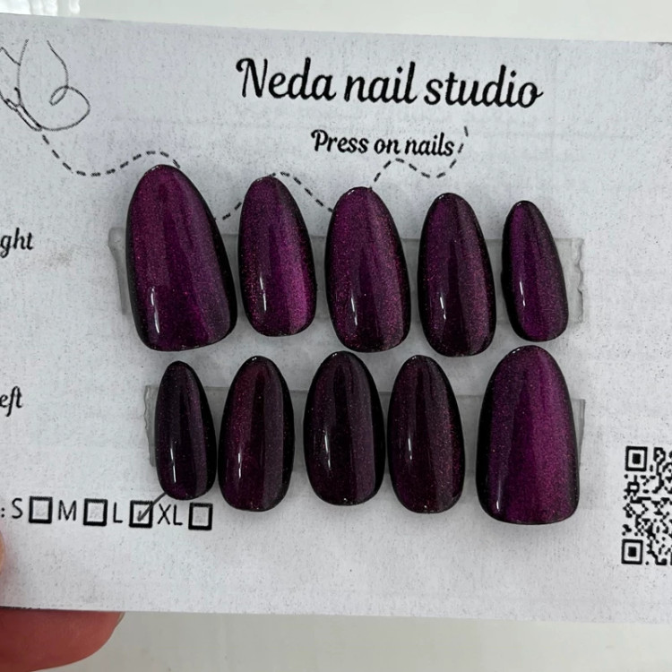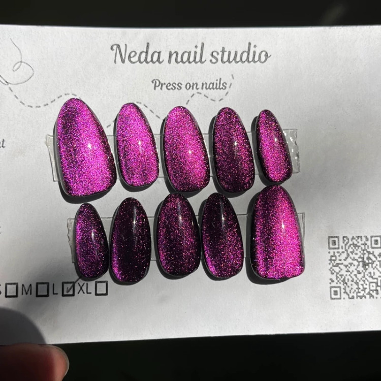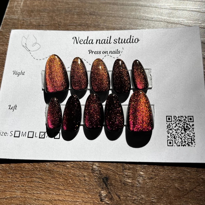 ناخن مصنوعی از جنس کاشت و دارای سایز بندی ایکس اسمال , اسمال ، مدیوم ، لارج و از جنس متریال کاشت ژل ناخن رنگ کار چند رنگ مگنتی هست که در زوایای مختلف نوری تغییر رنگ میدهد چند بار مصرف هستند و اصلا نمیشکنند. میتوانید با چسب دو طرفه ناخن بصورت موقت با ماندگاری چند ساعت تا چند روز استفاده کنید ( و به صورت مادام العمر داشته باشیدشون ) یا با چسب مایع از یک هفته تا سه هفته ماندگاری داشته باشید نحوه اندازه گیری سایز ناخن و سایز بندی ها داخل عکس ها هست و اگر سایز ناخنتون تفاوت داشت میتونید برام بفرستید تا بسازم براتون.