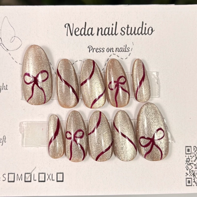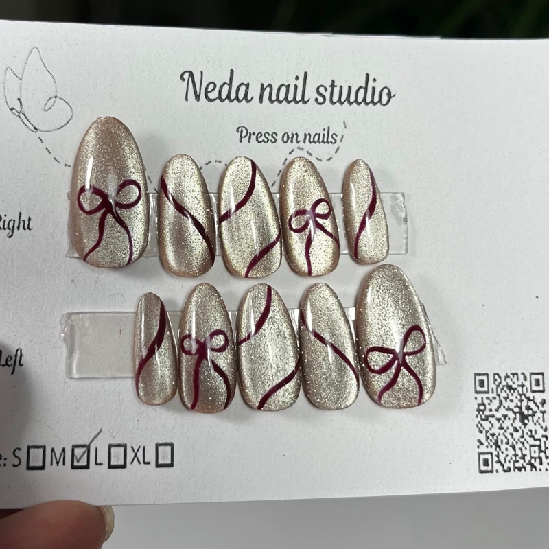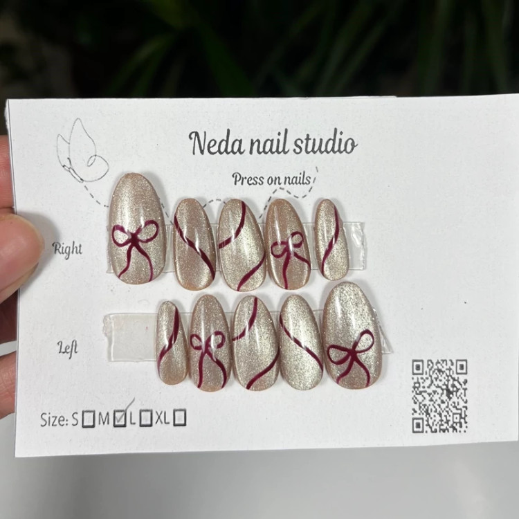 ناخن مصنوعی از جنس کاشت و دارای سایز بندی اسمال ، مدیوم ، لارج و ایکس لارج از جنس متریال کاشت ژل ناخن رنگ آیس دیسکو کاراملی با دیزاین زرشکی چند بار مصرف هستند و اصلا نمیشکنند. میتوانید با چسب دو طرفه ناخن بصورت موقت با ماندگاری چند ساعت تا چند روز استفاده کنید ( و به صورت مادام العمر داشته باشیدشون ) یا با چسب مایع از یک هفته تا سه هفته ماندگاری داشته باشید نحوه اندازه گیری سایز ناخن و سایز بندی ها داخل عکس ها هست و اگر سایز ناخنتون تفاوت داشت میتونید برام بفرستید تا بسازم براتون.