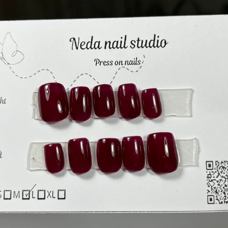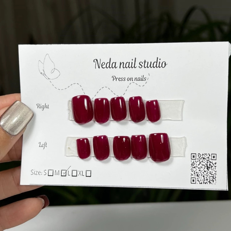 ناخن مصنوعی از جنس کاشت و دارای سایز بندی اسمال ، مدیوم ، لارج و ایکس اسمال از جنس متریال کاشت ژل رنگ زرشکی روی دست کاملا نچرال و مشابه کاشت دیده میشود و جایگزین عالی برای کاشت و لاک است چند بار مصرف هستند و اصلا نمیشکنند. میتوانید با چسب دو طرفه ناخن بصورت موقت با ماندگاری چند ساعت تا چند روز استفاده کنید ( و به صورت مادام العمر داشته باشیدشون ) یا با چسب مایع از یک هفته تا سه هفته ماندگاری داشته باشید نحوه اندازه گیری سایز ناخن و سایز بندی ها داخل عکس ها هست و اگر سایز ناخنتون تفاوت داشت میتونید برام بفرستید تا بسازم براتون.