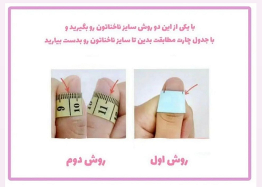 میتوانید سایز ناخنتون رو به روشی که داخل تصویر هست اندازه گیری و فرم مد نظرتون رو انتخاب نمایید.